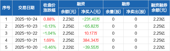 融资方面,当日融资买入661.37万元,融资偿还892.77万元,融资净偿还231.4万元。融券方面,融券卖出0股,融券偿还0股,融券余量0股,融券余额0元。融资融券余额合计2.23亿元。