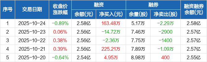 融资方面,当日融资买入589.82万元,融资偿还426.34万元,融资净买入163.48万元。融券方面,融券卖出100股,融券偿还2.3万股,融券余量5.17万股,融券余额80.34万元。融资融券余额合计2.58亿元。