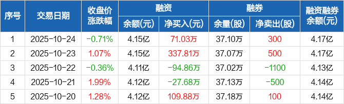 融资方面,当日融资买入885.09万元,融资偿还814.06万元,融资净买入71.03万元。融券方面,融券卖出1300股,融券偿还1000股,融券余量37.1万股,融券余额208.87万元。融资融券余额合计4.17亿元。