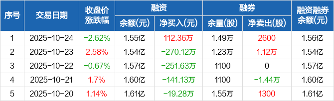 融资方面,当日融资买入407.01万元,融资偿还294.65万元,融资净买入112.36万元。融券方面,融券卖出2800股,融券偿还200股,融券余量1.49万股,融券余额13.29万元。融资融券余额合计1.56亿元。