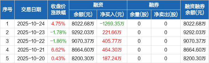 融资方面,当日融资买入1196.85万元,融资偿还2466.2万元,融资净偿还1269.35万元,净偿还额创12个月新高。融券方面,融券卖出0股,融券偿还0股,融券余量0股,融券余额0元。融资融券余额合计8022.68万元。