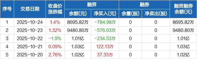 浩瀚深度融资融券信息显示,2025年10月24日融资净偿还784.98万元;融资余额8695.82万元,较前一日下降8.28%。