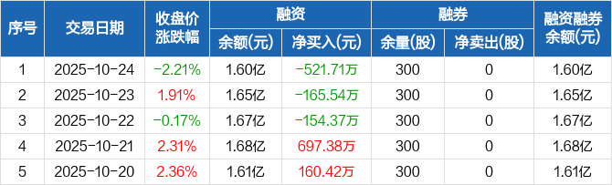 融资方面,当日融资买入372.05万元,融资偿还893.76万元,融资净偿还521.71万元,连续3日净偿还累计841.61万元。融券方面,融券卖出0股,融券偿还0股,融券余量300股,融券余额1722元。融资融券余额合计1.6亿元。