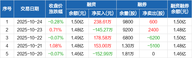 融资方面,当日融资买入445.76万元,融资偿还207.15万元,融资净买入238.61万元。融券方面,融券卖出600股,融券偿还0股,融券余量9800股,融券余额13.79万元。融资融券余额合计1.5亿元。