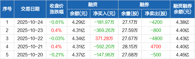 口子窖融资融券信息显示,2025年10月24日融资净偿还181.97万元;融资余额4.29亿元,创近一年新低,较前一日下降0.42%。