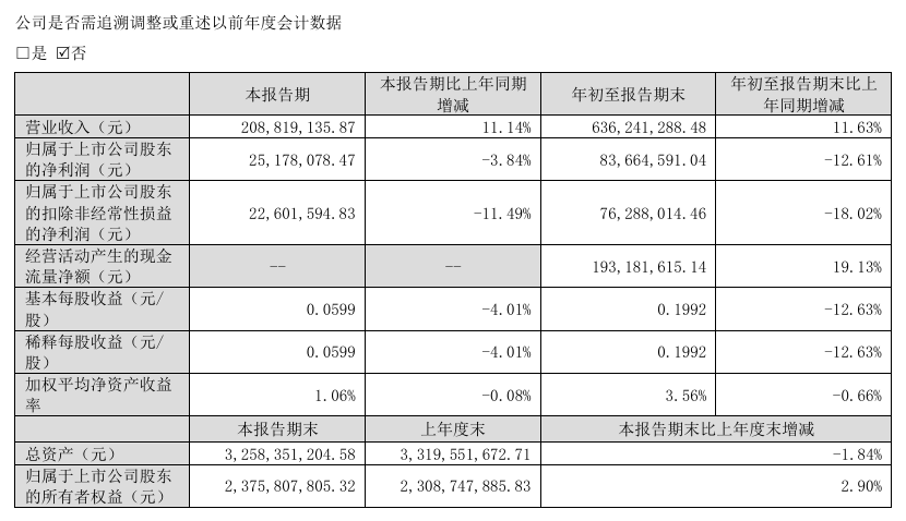 其中第三季度,公司营业收入为2.09亿元,同比上升11.1%;归母净利润为2518万元,同比下降3.8%;扣非归母净利润为2260万元,同比下降11.5%;EPS为0.06元。
