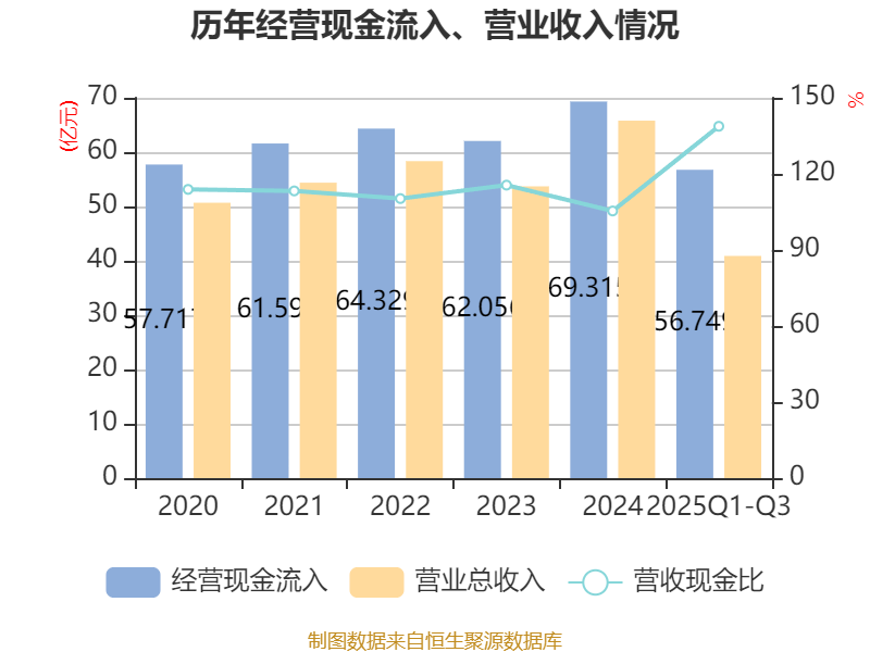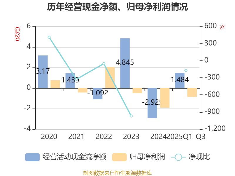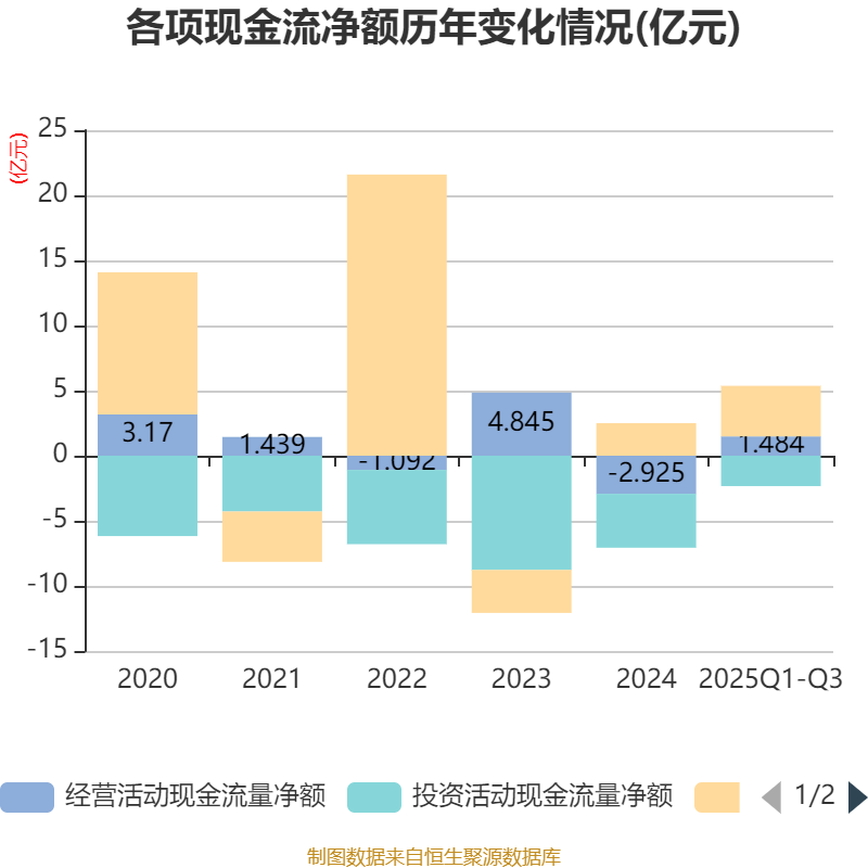 2025年前三季度,公司经营活动现金流净额为1.48亿元,同比增加5.22亿元;筹资活动现金流净额3.88亿元,同比增加3194.31万元;投资活动现金流净额-2.34亿元,上年同期为-5.51亿元。