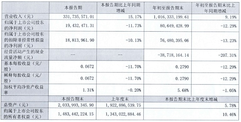 中证智能财讯富邦科技(300387)10月27日披露2025年第三季度报告。前三季度公司实现营业总收入10.16亿元,同比增长9.19%;归母净利润8064.94万元,同比下降12.29%;扣非净利润7648.04万元,同比下降13.23%;经营活动产生的现金流量净额为-3871.82万元,上年同期为3608.12万元;报告期内,富邦科技基本每股收益为0.279元,加权平均净资产收益率为5.68%。