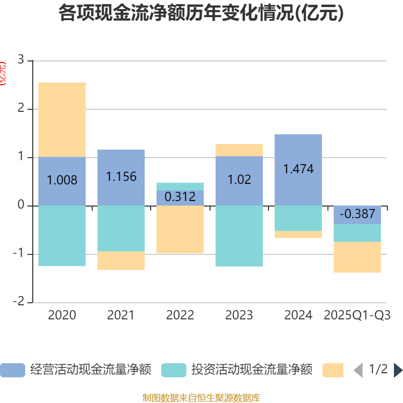 2025年前三季度,公司经营活动现金流净额为-3871.82万元,同比减少7479.94万元;筹资活动现金流净额-6365.9万元,同比减少5871.35万元;投资活动现金流净额-3628.32万元,上年同期为-4689.22万元。