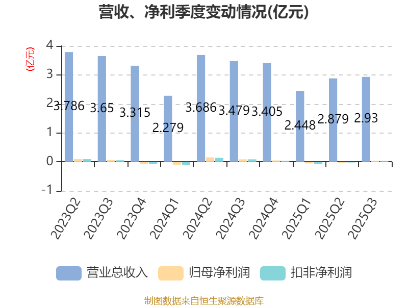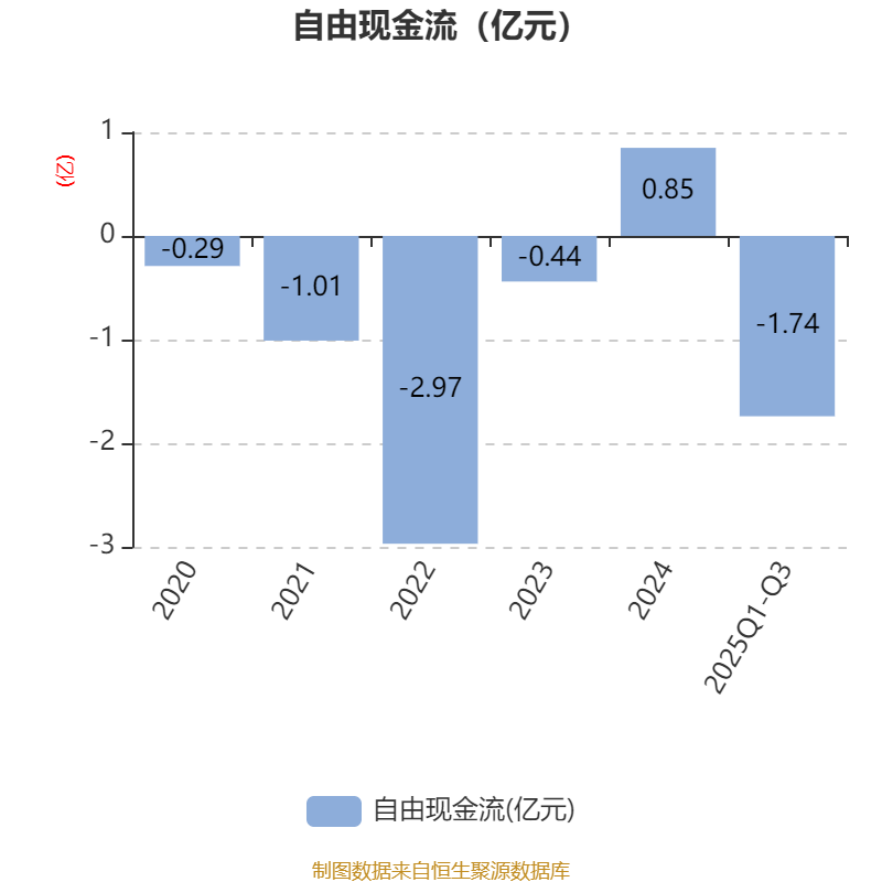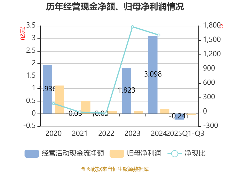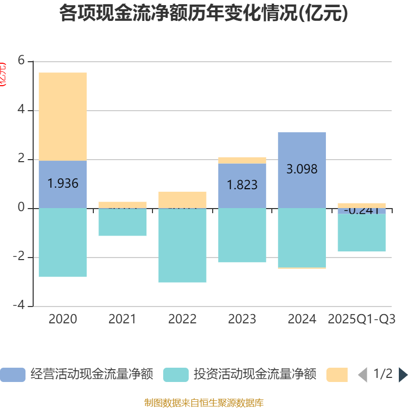 2025年前三季度,公司经营活动现金流净额为-2406.62万元,同比减少9591.41万元;筹资活动现金流净额1980.6万元,同比减少1.22亿元;投资活动现金流净额-1.53亿元,上年同期为-2.11亿元。