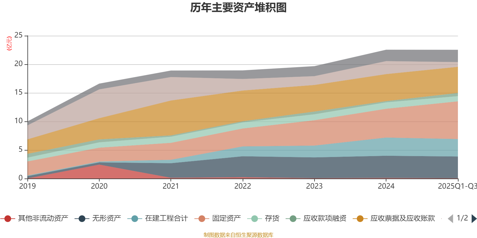 资产重大变化方面,截至2025年三季度末,公司固定资产较上年末增加30.82%,占公司总资产比重上升6.92个百分点;货币资金较上年末减少63.12%,占公司总资产比重下降6.36个百分点;应收款项融资较上年末增加157.1%,占公司总资产比重上升1.5个百分点;存货较上年末减少17.94%,占公司总资产比重下降0.89个百分点。