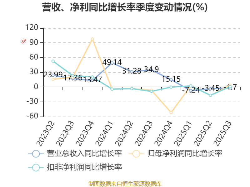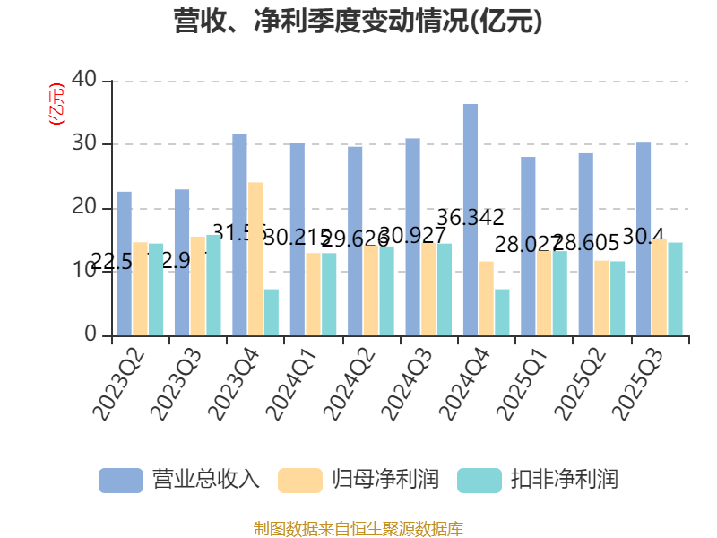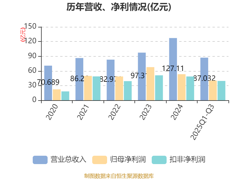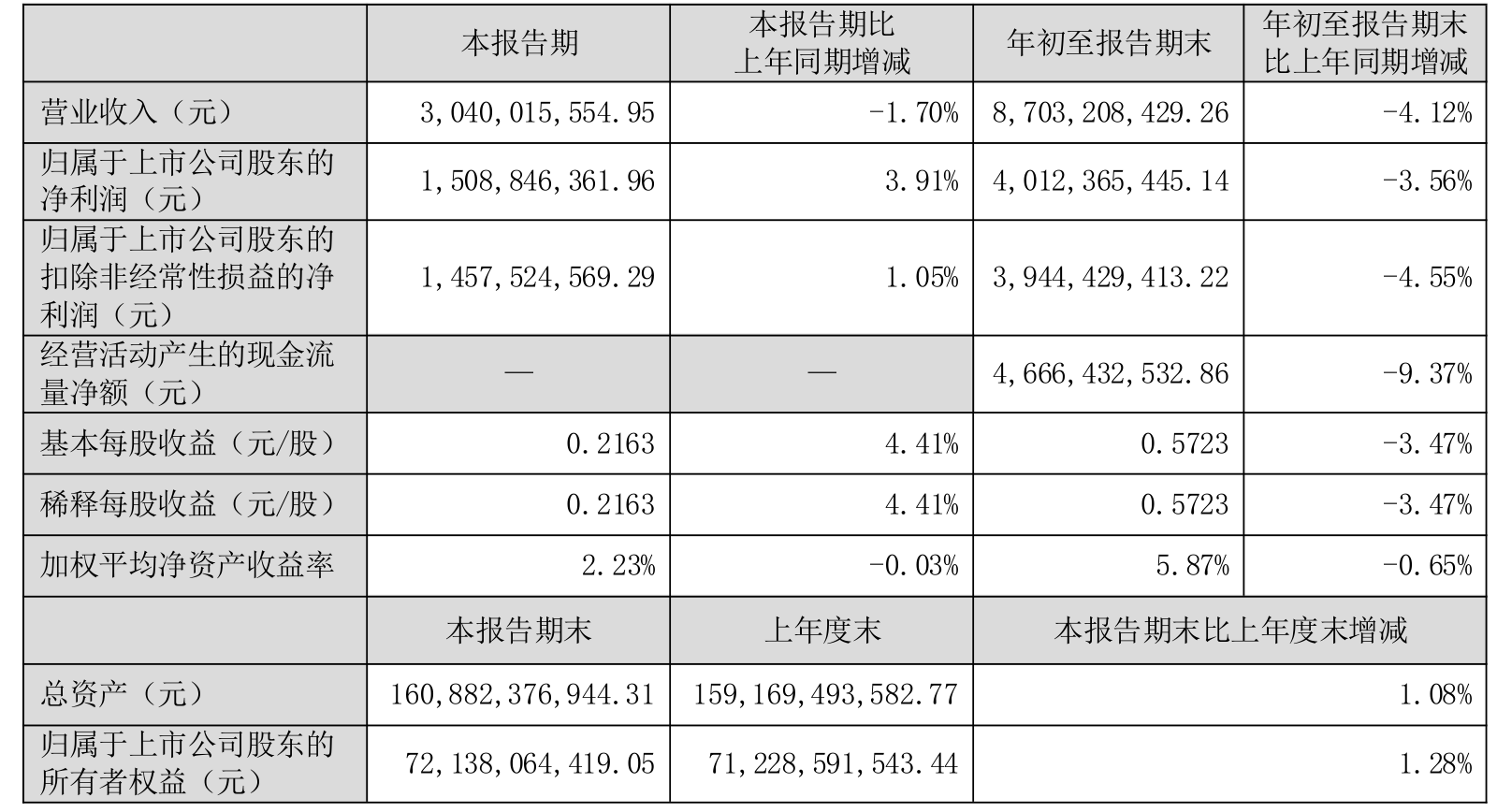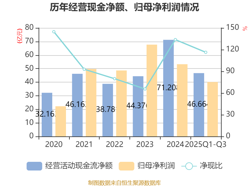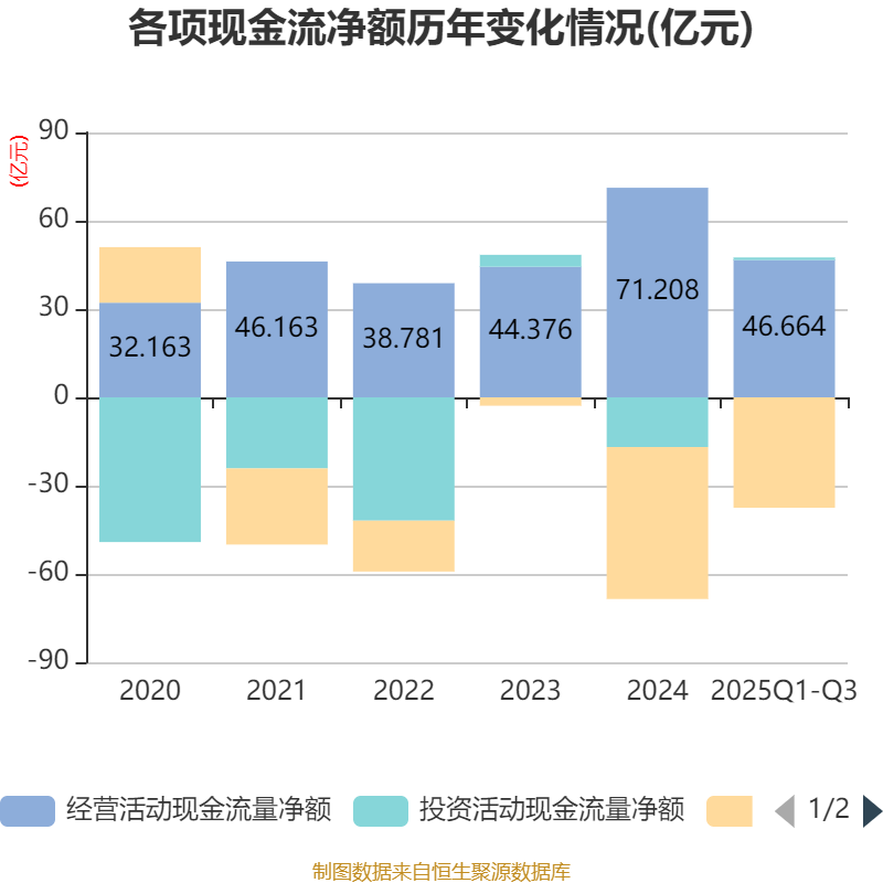 2025年前三季度,公司经营活动现金流净额为46.66亿元,同比下降9.37%;筹资活动现金流净额-37.51亿元,同比减少1325.3万元;投资活动现金流净额8561.58万元,上年同期为-37.64亿元。