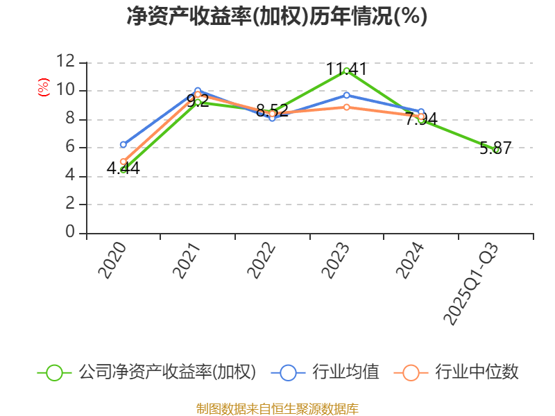 盈利能力方面, 2025年前三季度公司加权平均净资产收益率为5.87%,同比下降0.65个百分点。公司2025年前三季度投入资本回报率为3.7%,较上年同期下降0.41个百分点。