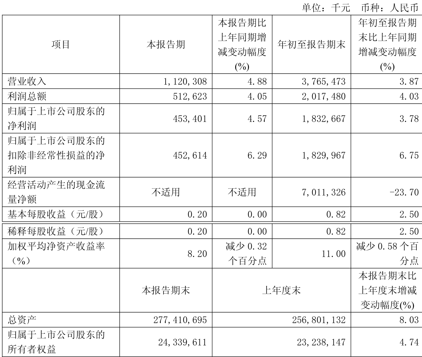 中证智能财讯无锡银行(600908)10月27日披露2025年第三季度报告。前三季度公司实现营业总收入37.65亿元,同比增长3.87%;归母净利润18.33亿元,同比增长3.78%;扣非净利润18.3亿元,同比增长6.75%;经营活动产生的现金流量净额为70.11亿元,同比下降23.70%;报告期内,无锡银行基本每股收益为0.82元,加权平均净资产收益率为8.25%。