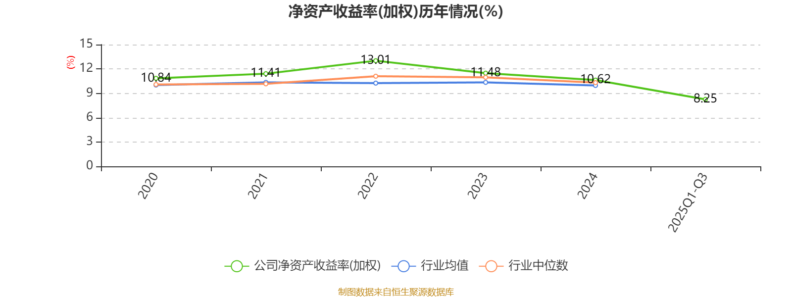 盈利能力方面, 2025年前三季度公司加权平均净资产收益率为8.25%,同比下降0.44个百分点。