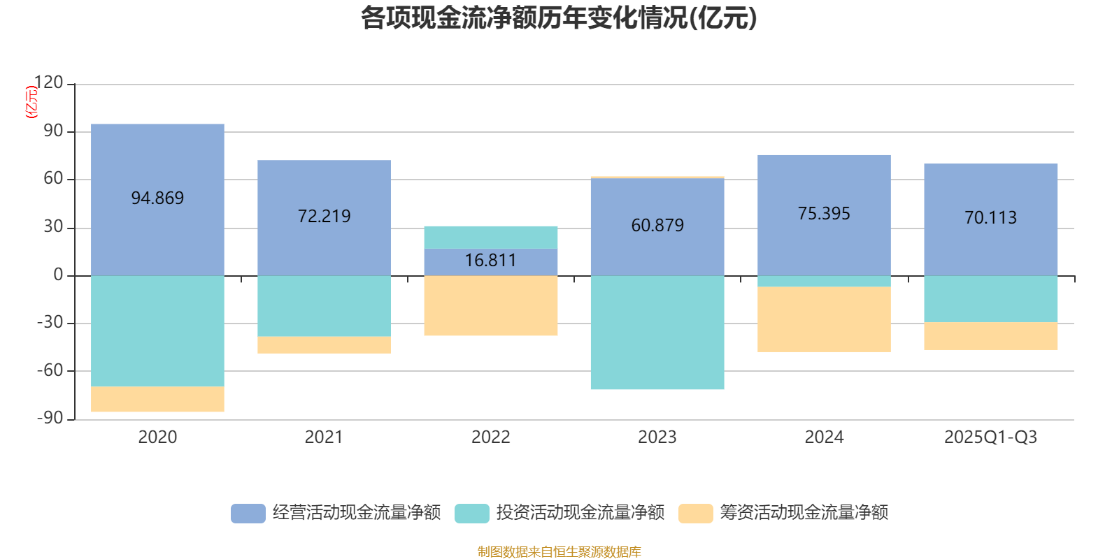2025年前三季度,公司经营活动现金流净额为70.11亿元,同比下降23.7%;筹资活动现金流净额-17.42亿元,同比增加33.21亿元;投资活动现金流净额-29.26亿元,上年同期为13.34亿元。