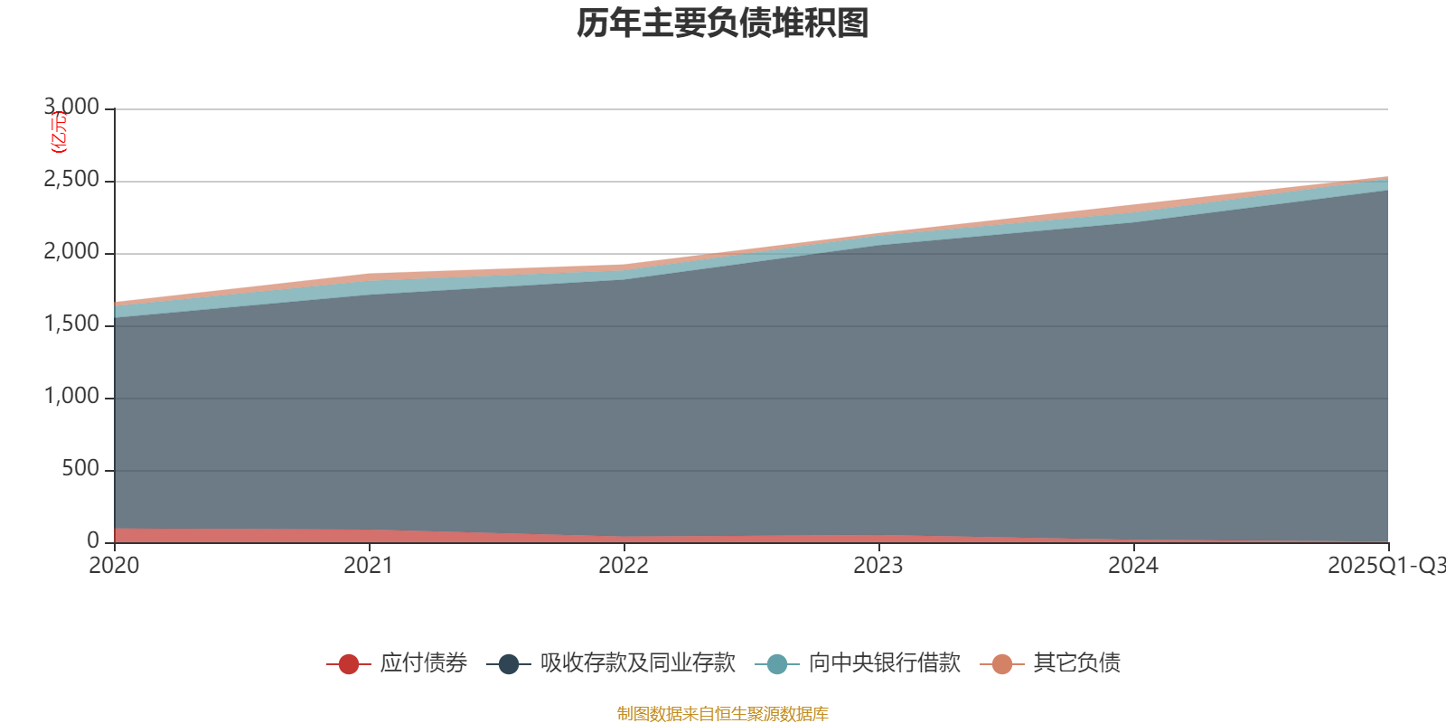 负债重大变化方面,截至2025年三季度末,公司吸收存款及同业存款较上年末增加10.77%,占公司总资产比重上升2.17个百分点;卖出回购金融资产款较上年末减少100%,占公司总资产比重下降1.71个百分点;应付债券较上年末减少70.4%,占公司总资产比重下降0.48个百分点;向中央银行借款较上年末增加14.41%,占公司总资产比重上升0.16个百分点。