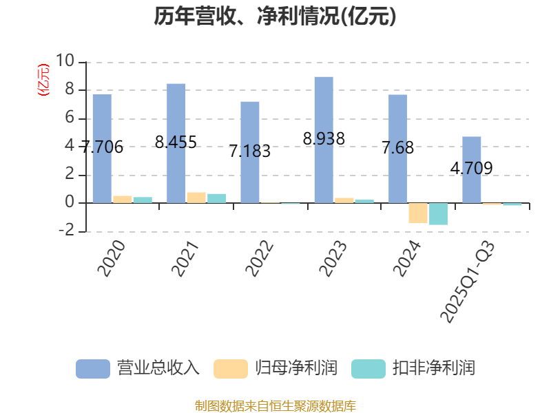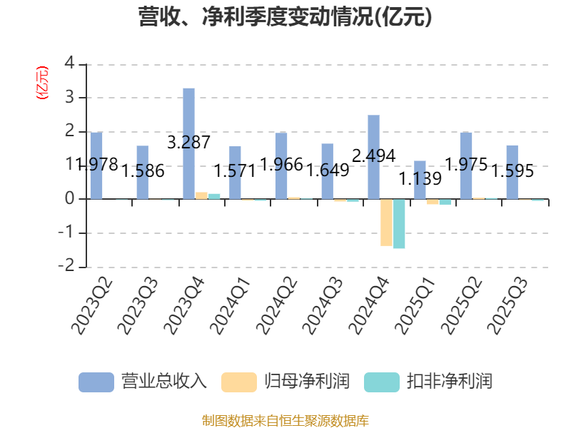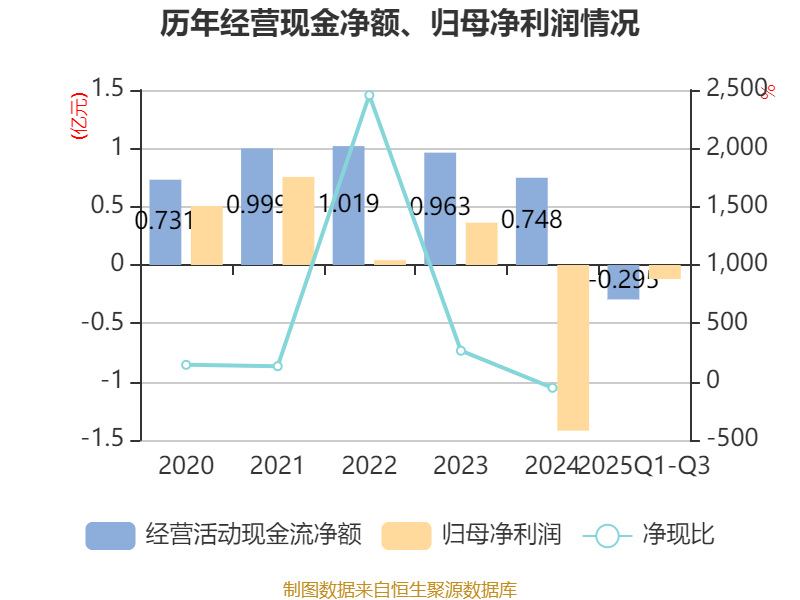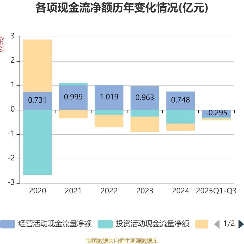 2025年前三季度,公司经营活动现金流净额为-2946.96万元,同比减少1055.87万元;筹资活动现金流净额-734.88万元,同比增加2005.78万元;投资活动现金流净额-623.7万元,上年同期为-3426.85万元。