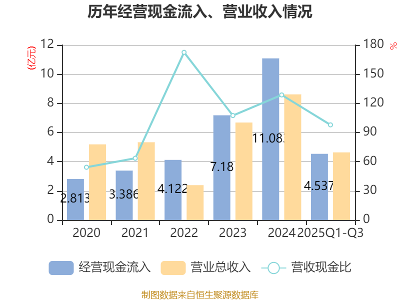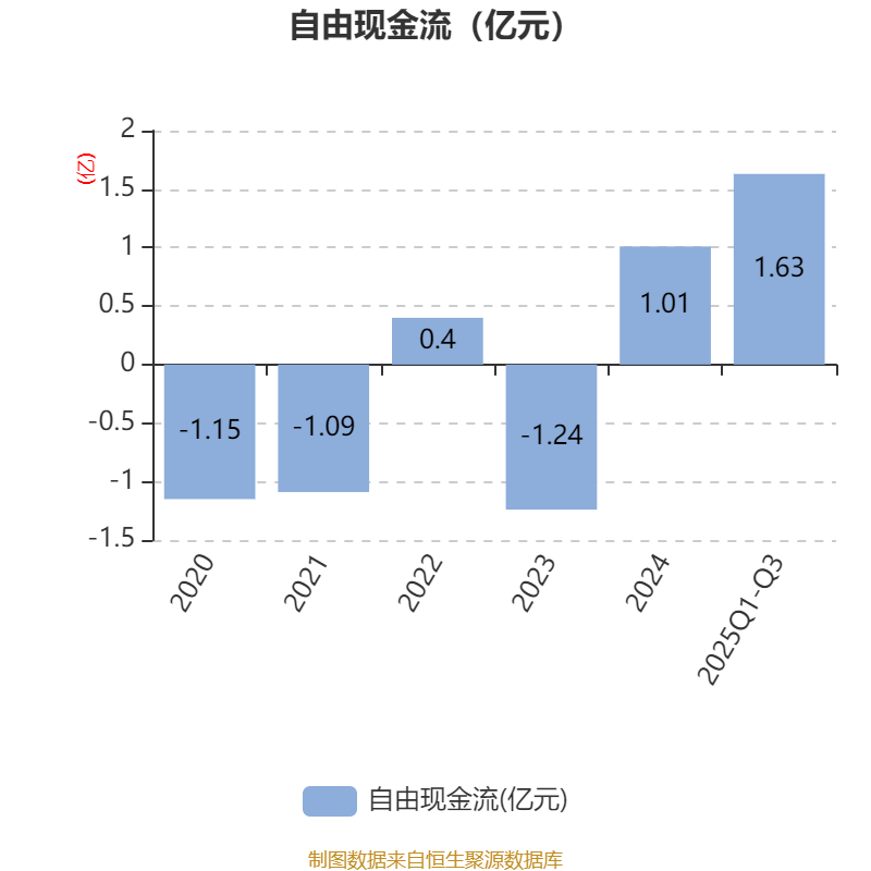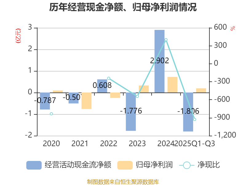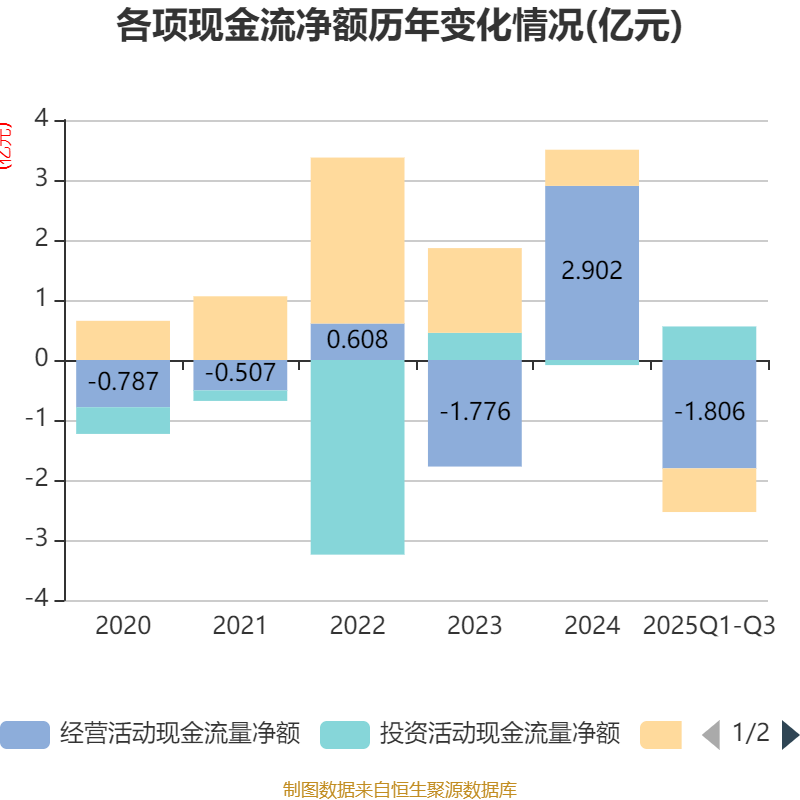 2025年前三季度,公司经营活动现金流净额为-1.81亿元,同比减少2.83亿元;筹资活动现金流净额-7276.88万元,同比减少7218.39万元;投资活动现金流净额5593.54万元,上年同期为-710.65万元。