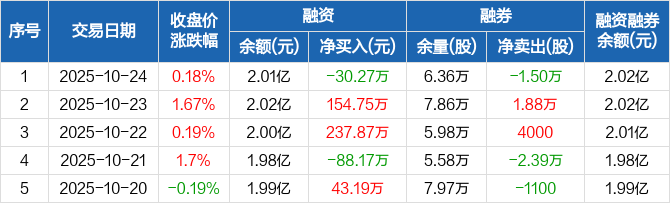 融资方面,当日融资买入1718.69万元,融资偿还1748.96万元,融资净偿还30.27万元。融券方面,融券卖出800股,融券偿还1.58万股,融券余量6.36万股,融券余额34.85万元。融资融券余额合计2.02亿元。
