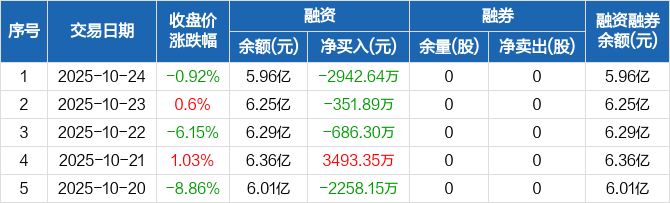 融资方面,当日融资买入8011.99万元,融资偿还1.1亿元,融资净偿还2942.64万元,连续3日净偿还累计3980.83万元。融券方面,融券卖出0股,融券偿还0股,融券余量0股,融券余额0元。融资融券余额合计5.96亿元。