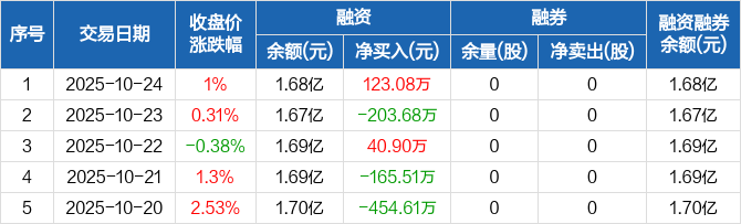 融资方面,当日融资买入495.52万元,融资偿还372.44万元,融资净买入123.08万元。融券方面,融券卖出0股,融券偿还0股,融券余量0股,融券余额0元。融资融券余额合计1.68亿元。