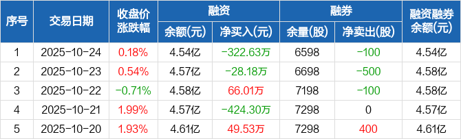 融资方面,当日融资买入622.09万元,融资偿还944.72万元,融资净偿还322.63万元。融券方面,融券卖出0股,融券偿还100股,融券余量6598股,融券余额7.45万元。融资融券余额合计4.54亿元。