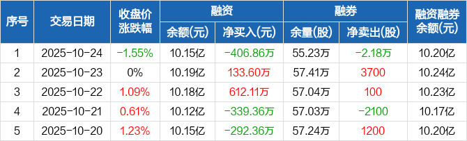 融资方面,当日融资买入918.13万元,融资偿还1324.99万元,融资净偿还406.86万元。融券方面,融券卖出1900股,融券偿还2.37万股,融券余量55.23万股,融券余额455.1万元。融资融券余额合计10.2亿元。