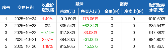 融资方面,当日融资买入362.62万元,融资偿还187.55万元,融资净买入175.06万元。融券方面,融券卖出0份,融券偿还0份,融券余量0份,融券余额0元。融资融券余额合计1010.6万元。