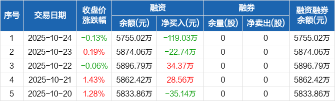 融资方面,当日融资买入121.02万元,融资偿还240.06万元,融资净偿还119.03万元。融券方面,融券卖出0股,融券偿还0股,融券余量0股,融券余额0元。融资融券余额合计5755.02万元。