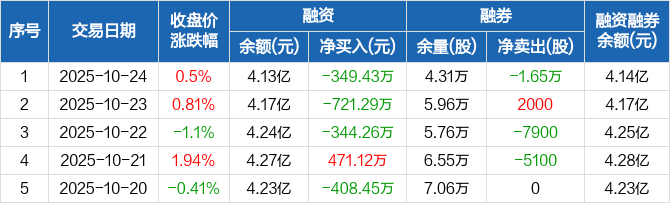 融资方面,当日融资买入772.55万元,融资偿还1121.98万元,融资净偿还349.43万元,连续3日净偿还累计1414.98万元。融券方面,融券卖出0股,融券偿还1.65万股,融券余量4.31万股,融券余额43.1万元。融资融券余额合计4.14亿元。