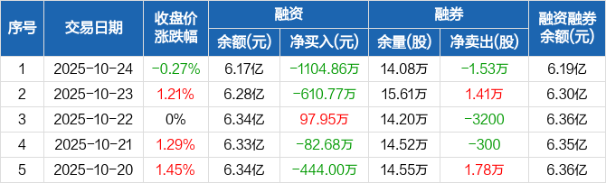 融资方面,当日融资买入1738.07万元,融资偿还2842.93万元,融资净偿还1104.86万元。融券方面,融券卖出200股,融券偿还1.55万股,融券余量14.08万股,融券余额211.76万元。融资融券余额合计6.19亿元。