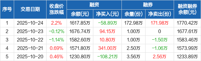 融资方面,当日融资买入206.98万元,融资偿还265.87万元,融资净偿还58.89万元。融券方面,融券卖出172.97万份,融券偿还9900份,融券余量172.98万份,融券余额152.57万元。融资融券余额合计1770.42万元。