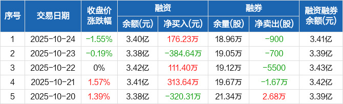 融资方面,当日融资买入1044.2万元,融资偿还867.98万元,融资净买入176.23万元。融券方面,融券卖出1200股,融券偿还2100股,融券余量18.96万股,融券余额96.32万元。融资融券余额合计3.41亿元。