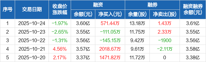 融资方面,当日融资买入3702.07万元,融资偿还3130.63万元,融资净买入571.44万元。融券方面,融券卖出1.61万股,融券偿还1800股,融券余量13.18万股,融券余额85.41万元。融资融券余额合计3.61亿元。