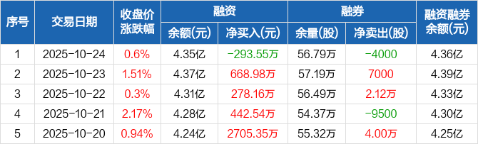 融资方面,当日融资买入1269.37万元,融资偿还1562.92万元,融资净偿还293.55万元。融券方面,融券卖出4600股,融券偿还8600股,融券余量56.79万股,融券余额191.95万元。融资融券余额合计4.36亿元。