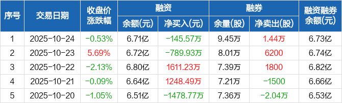 融资方面,当日融资买入6310.09万元,融资偿还6455.67万元,融资净偿还145.57万元。融券方面,融券卖出1.89万股,融券偿还4500股,融券余量9.45万股,融券余额228.6万元。融资融券余额合计6.73亿元。