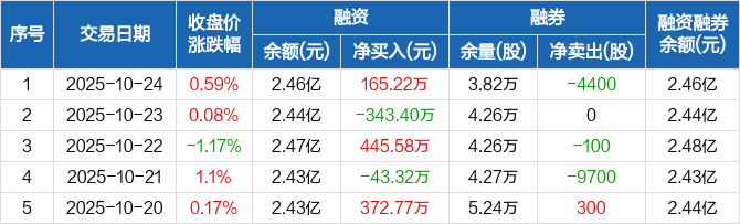 融资方面,当日融资买入1562.39万元,融资偿还1397.17万元,融资净买入165.22万元。融券方面,融券卖出0股,融券偿还4400股,融券余量3.82万股,融券余额45.5万元。融资融券余额合计2.46亿元。