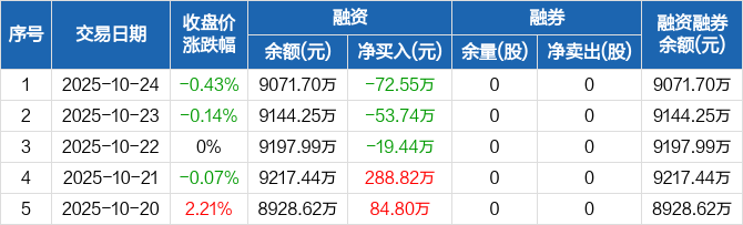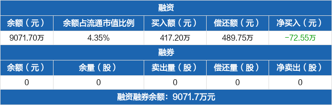 融资方面,当日融资买入417.2万元,融资偿还489.75万元,融资净偿还72.55万元,连续3日净偿还累计145.73万元。融券方面,融券卖出0股,融券偿还0股,融券余量0股,融券余额0元。融资融券余额合计9071.7万元。