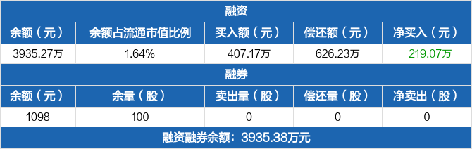 融资方面,当日融资买入407.17万元,融资偿还626.23万元,融资净偿还219.07万元。融券方面,融券卖出0股,融券偿还0股,融券余量100股,融券余额1098元。融资融券余额合计3935.38万元。