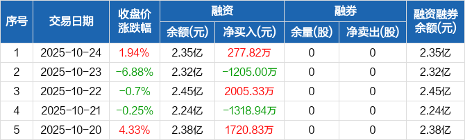 融资方面,当日融资买入3196.47万元,融资偿还2918.65万元,融资净买入277.82万元。融券方面,融券卖出0股,融券偿还0股,融券余量0股,融券余额0元。融资融券余额合计2.35亿元。