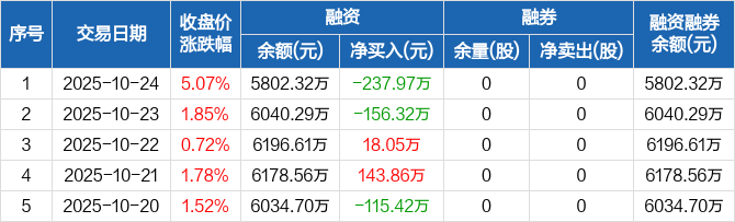 辰奕智能融资融券信息显示,2025年10月24日融资净偿还237.97万元;融资余额5802.32万元,较前一日下降3.94%