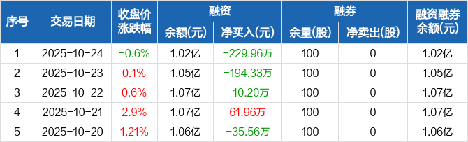融资方面,当日融资买入329.8万元,融资偿还559.75万元,融资净偿还229.96万元,连续3日净偿还累计434.49万元。融券方面,融券卖出0股,融券偿还0股,融券余量100股,融券余额1988元。融资融券余额合计1.02亿元。