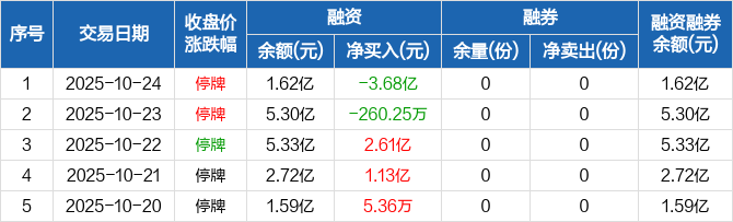 融资方面,当日融资买入1166.83万元,融资偿还3.8亿元,融资净偿还3.68亿元。融券方面,融券卖出0份,融券偿还0份,融券余量0份,融券余额0元。融资融券余额合计1.62亿元。