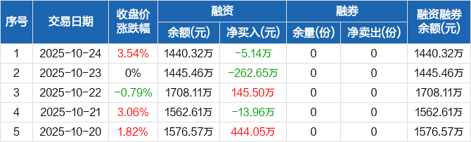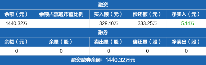 融资方面,当日融资买入328.1万元,融资偿还333.25万元,融资净偿还5.14万元。融券方面,融券卖出0份,融券偿还0份,融券余量0份,融券余额0元。融资融券余额合计1440.32万元。