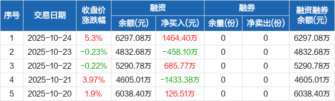 融资方面,当日融资买入2964.29万元,融资偿还1499.9万元,融资净买入1464.4万元,净买入额创12个月新高。融券方面,融券卖出0份,融券偿还0份,融券余量0份,融券余额0元。融资融券余额合计6297.08万元。