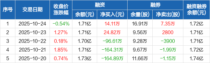 融资方面,当日融资买入640.68万元,融资偿还626.58万元,融资净买入14.11万元。融券方面,融券卖出7.45万股,融券偿还1000股,融券余量16.91万股,融券余额94.02万元。融资融券余额合计1.72亿元。
