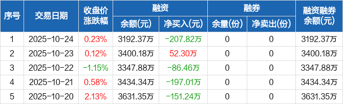 融资方面,当日融资买入115.05万元,融资偿还322.87万元,融资净偿还207.82万元。融券方面,融券卖出0份,融券偿还0份,融券余量0份,融券余额0元。融资融券余额合计3192.37万元。