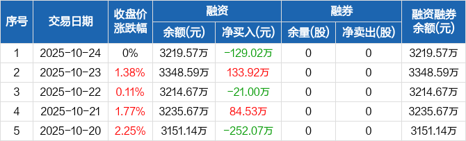 恒达新材融资融券信息显示,2025年10月24日融资净偿还129.02万元;融资余额3219.57万元,较前一日下降3.85%。