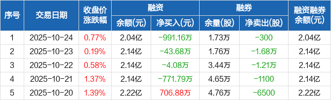 融资方面,当日融资买入778.58万元,融资偿还1769.74万元,融资净偿还991.16万元,连续4日净偿还累计1810.72万元。融券方面,融券卖出0股,融券偿还300股,融券余量1.73万股,融券余额9.08万元。融资融券余额合计2.04亿元。